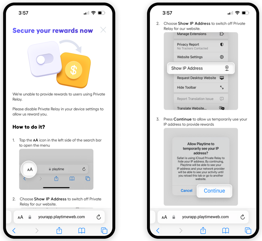 For iOS users Apple provides an opportunity to use the iCloud Private Relay service, which can be enabled in the device settings. If the user has it enabled, then we cannot track the user’s real IP, since all the requests would be proxied via Apple servers. This can have an impact on our ability to reward users for playing games or using apps. In cases where iCloud Private Relay enabled, users would see the following messages asking them to disable it. We will not permit users to user Playtime without disabling this feature.